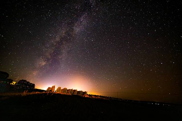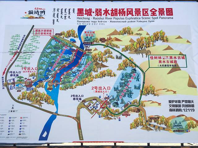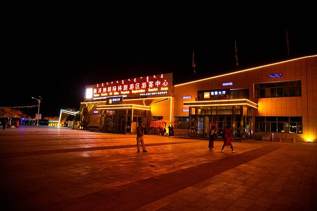 临河到额济纳路程680公里,一路上走走停停到达额济纳胡杨林景区已经是晚上八九点。从邻近额济纳就已看到灯火通明,进入城镇遍布着大大小小的酒店,一改沙漠的荒芜,有如一个不夜城,霓虹闪烁,宽广的沥青道路,这样的改变当然是归功于旅游产业的效益。考虑到属于旺季,进入景区人比较多,也就没有找住的地方,车上凑合了几个小时凌晨4点吃了干粮便进入景区,但此时各大旅游团也开始聚拢起来,所以建议游玩的旅客还是需要打好提前量。