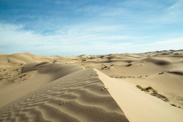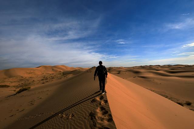 行至一处不知名的路段,看到道路边的一处沙漠,没有多想就停下车带好装备前去攀登。这里的沙漠比起额济纳的沙漠更多了一份宁静,没有多余的游客打扰,沙质干净,风在沙丘上留下一道道足迹,站在沙丘之上,此起彼伏的沙丘如海浪般,一条条沙脊在沙丘上蜿蜒,呼啸的风带来沙的鸣唱。