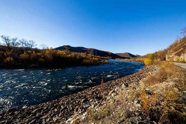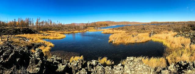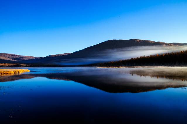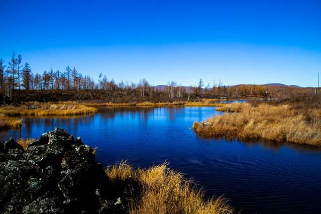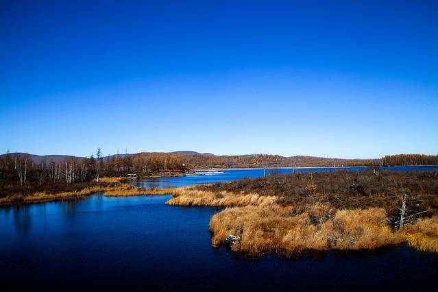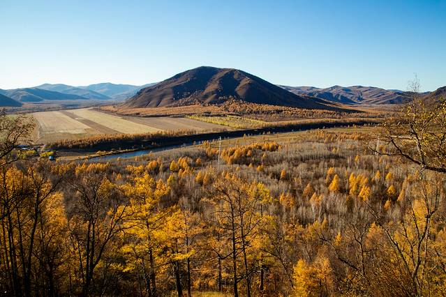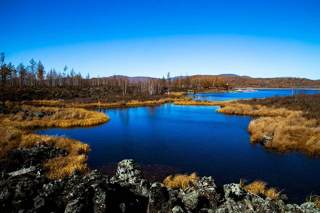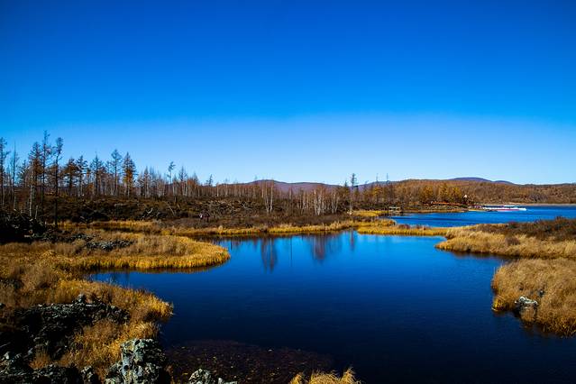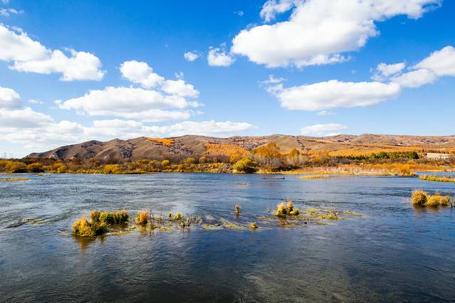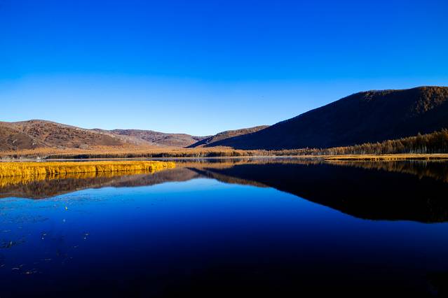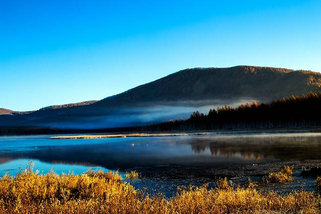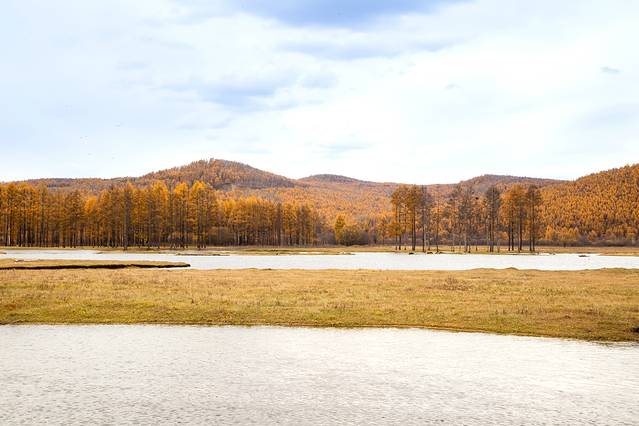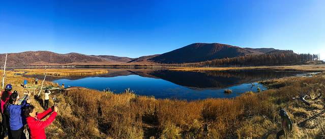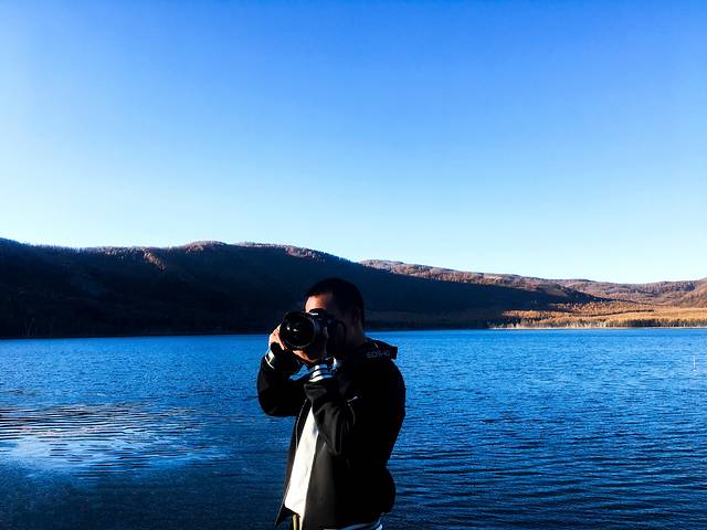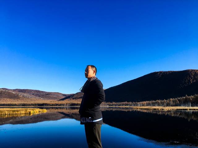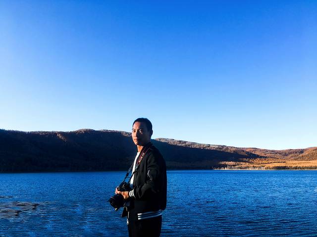 进入阿尔山之前的一段道路就已经让我拿起手中的单反抓拍起来,河水清澈倒映蓝天的影子,远处山坡上的松树披上金黄的外衣,沿着山体依势而上,错落有致,有别于一整片的壮美,这里已经跟内蒙的北边不同,这里以川、河、谷地为主,气候也较之变化更多,来时同学已说九月底已经下了一场雪,让我看好日子。正是由于独特的山体走势行成了阿尔山独具特色的醉人秋景,更是让他成为中国秋景的入围之地。