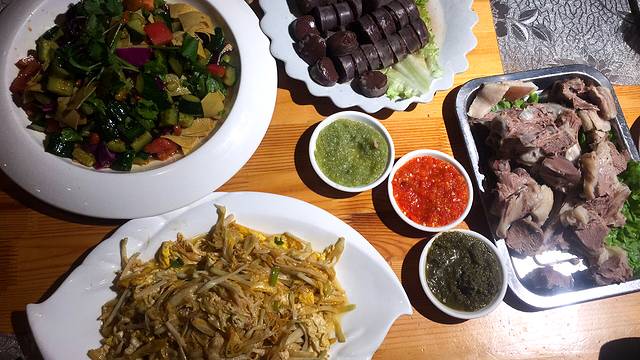 七八点的时候此额尔古纳除了主干道有灯光外,其他地方基本黑的,开业的商铺也不是很多,在美团上找了半天才有一家比较近的,还都是绕了很长的路进入的一片蒙古包,进去后也就只有我们几个人,可以选择的东西不多,此时饥肠辘辘有的吃已经非常满足了。听老板的意思,这里的饭店基本也都是夏季才营业,那时候是爆满的,当地人一般有自己的牧场,出租给外地的人做商用,他们一家算是走的晚的,等过段时间天一冷也就关门走了。