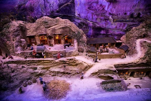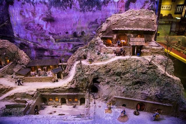 对于旧物件我是一点都不懂,但是博物馆中间的民俗墙引起了我不少的兴趣,狭长的玻璃柜内形象的再现了西北人民那时的生活环境,窑洞、地井、磨坊等,看着这些加之自己的想象仿佛一切都活过来了。