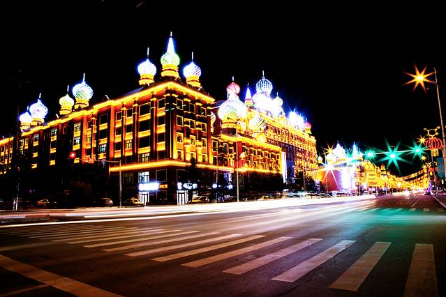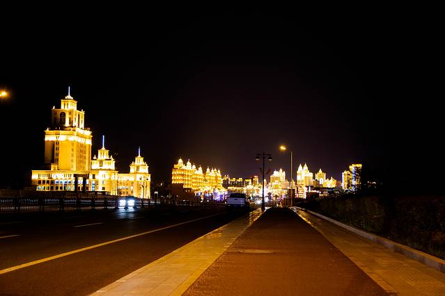 额尔古纳市就一条主干道,基本的酒店都在这里,建筑灯光基本也集中在这里,最好看的就是核心区的国际酒店,一个俄式建筑,在灯光的照射下引人夺目。