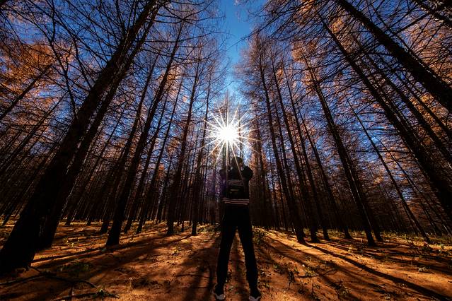 地上已散落厚厚的一层松针,踩在上面略带弹性,空气中散发着阵阵松木清香,风穿梭在枝叶间唱着特有的乐章,猝不及防的一脚便是一场松针细雨,金黄的松针飘落着,抬头望去,笔直的松树在天际围成一个圈,阳光透过松枝的间隙送来一道美丽的光影。