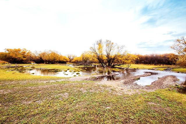 告别怪树林折道回临河途径的一段河流,停留的车辆还是挺多的,荒芜的土地上,几棵茂盛的胡杨装点着这里,一种说不出的广阔。