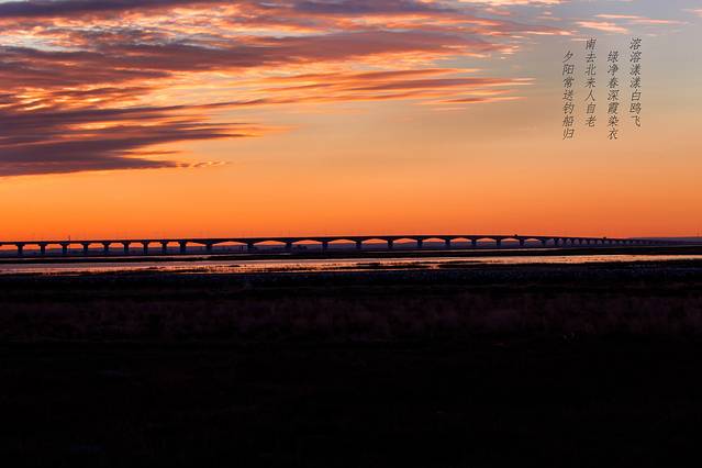 清晨带着干粮便来到黄河边,因为安全的问题,路边拉着围栏,此时天际已泛红,远处的黄河大桥横跨黄河之上,一个个孔洞延绵到尽头,第一次看到如此壮阔的景象内心的激动自不言而喻。深秋的黄河边,芦苇泛黄,顶上的花絮似乎不想离开母亲的怀抱,凉风袭来,还在摇曳着身姿,吹的人的脸颊开始干裂;天际翱翔的孤雁在寻找自己的队伍,开始了自己的下一段旅途,此情此景,虽不是日落时分,但也不经想起落霞与孤鹜的诗句。