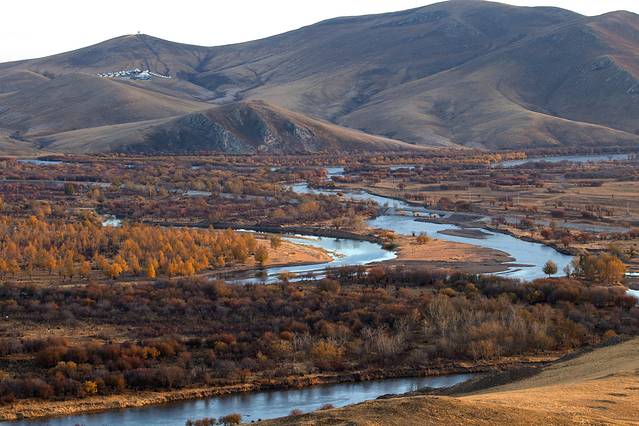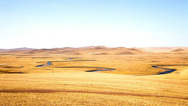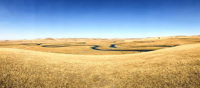 在坑洼的土路上行驶了半小时后终于到达一个不错的制高点,看到莫日格勒河的第一眼还是非常惊喜的,只见一条蜿蜒的玉带飘扬在黄色的土地上,虽不时刮起的风沙看着朦胧,也丝毫不影响远观起九曲十八弯的壮阔。莫日格勒河被作家老舍称谓天下第一曲水,虽然带有夸张性质,但站在这里,看着这如诗的婉约韵律,如画的飘逸线条,如歌的跳跃音符,如书法的酣畅墨意,纯粹的大自然的鬼斧神工。