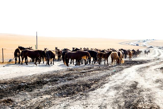 因为到了库布齐沙漠要收费,玩过了沙漠的我们也就没有再进去,回城的路上遇到放羊的大爷,一个人蹲坐在路边看养着一大群羊,初以为是家里几百头羊的隐形土豪,详聊下才知只是一位拿着很低工资的牧羊人,电视剧中凛冽的寒风中头戴雷锋帽,身披棉袄,双手揣衣袖中的朴素中国农民形象出现在我的面前。秋去春来,在茫茫的草原驱赶着羊儿寻找一片片草地,羊从羊羔长成了壮羊,牧羊人的鬓角的白发多了,草原的风在他的脸上烙上记忆。
