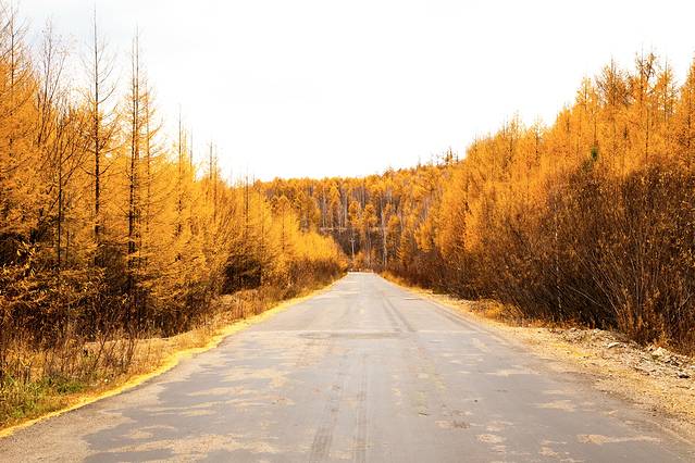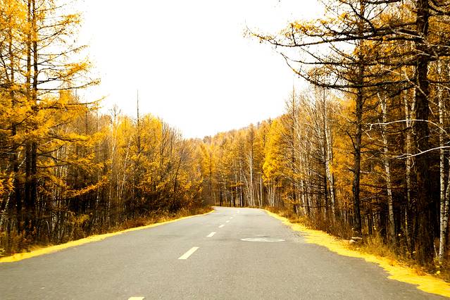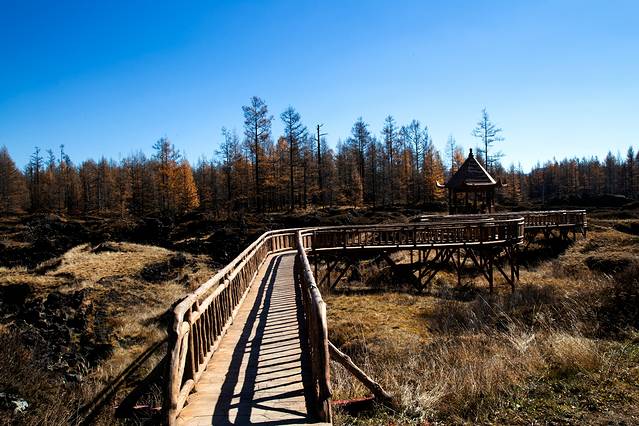 阿尔山景区位于阿尔山市的郊区路口,一条普通的道路,简单的大门后竟是醉人的秋。