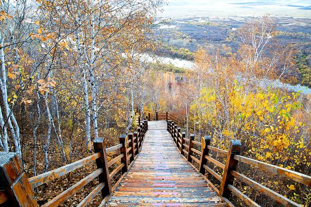 走在木栈道,虽已落尽许多的叶子,初见白桦林树还是觉得挺美的,心中仿佛因为朴树的《白桦林》一直都有着一种偏爱,白色挺直的树干与地上铺满的落叶,人走在期间,感受着属于秋的静美。