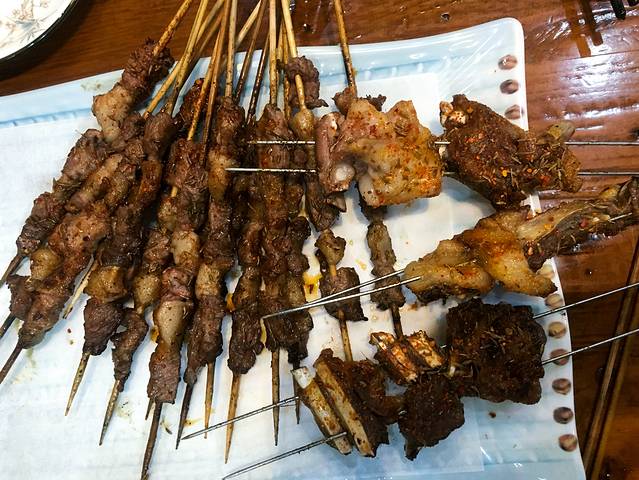 稍微收拾了一下,问下前台他们本地人常去的店就到了老焖头。门口很普通,进去里面环境还是很不错,品种很全,价格还可以,味道自然不必多说,似乎北方的烧烤因为地域的原因更让我觉得那一份撸串的惬意,总结那么一句,撸串还是北方好。