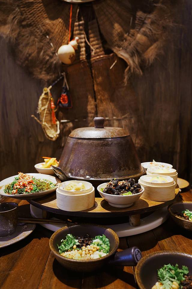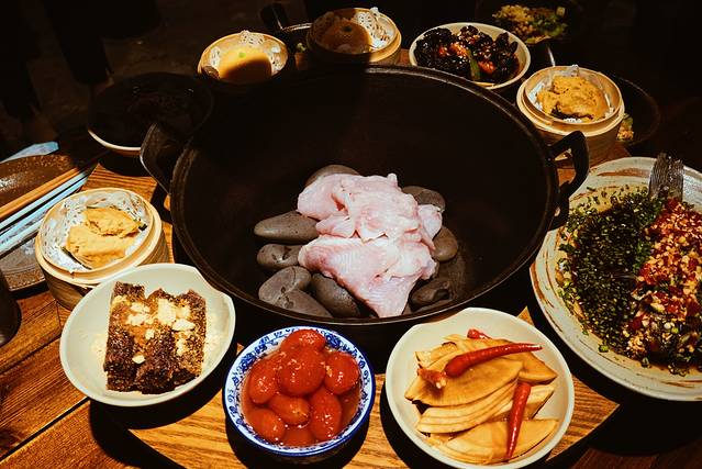 一进门我就被这家店的装饰所吸引,整体的装修风格特别的怀旧,墙面进行了做旧,挂有斗笠与斗篷,还有一些辣椒与酒坛子的装饰,给人感觉特别亲切。我们选择了最经典的红锅,原本以为是最原始的火锅,没想到出乎我的意料,一开始上的都是小菜,小而美的摆盘,很讲究色香味俱全,我们都已经按耐不住各种拍拍拍,拍完一圈最后的主角就上场了,服务员小姐姐端了一锅鹅卵石放到中间,说这个是经过高温处理过的鹅卵石,我们目瞪口呆的看着小姐姐熟练地倒入新鲜鱼肉,接着倒入红锅汤底,我不由得偷偷咽了好多次口水。