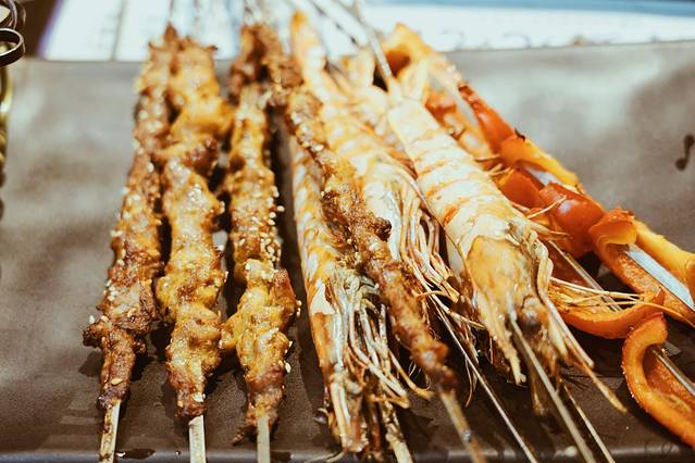 首先我想说的第一道特色菜是裸奔坨坨虾,名字很有意思,顾名思义就是虾是没皮的,直接给剥好了,用热油浇在虾肉上,滋啦滋啦的声音让我不由自主的咂巴咂巴嘴,也太有食欲了吧。还没等我感叹完便上来了第二道菜——特色烤鱼片,鱼片是用竹签串好,吃起来也比较方便,鱼肉口感很嫩滑,很新鲜,辣味也适中。