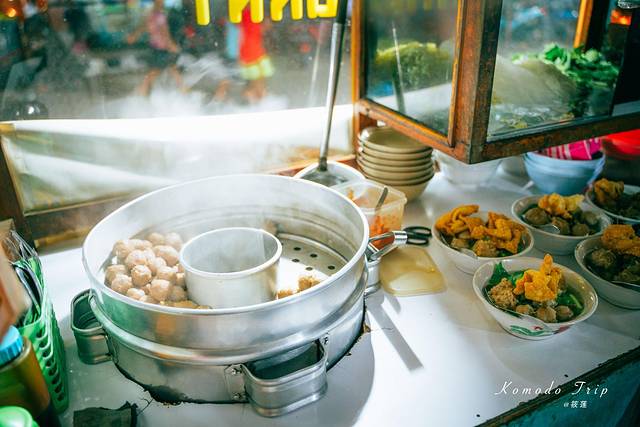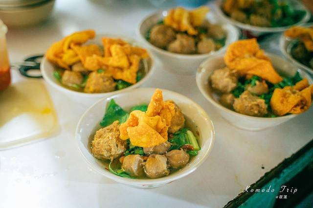 我最爱,也最推荐的是当地路边摊中最常见的牛肉丸,牛肉丸分大丸子、小丸子还有牛骨头三种,牛骨炖成的汤汁味道鲜美,再配上绿菜、粉丝,便成一碗地道的bakso,按个人需求加上酱汁即可。