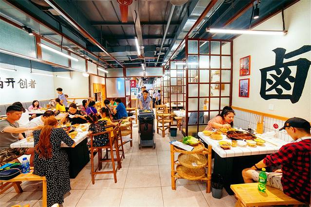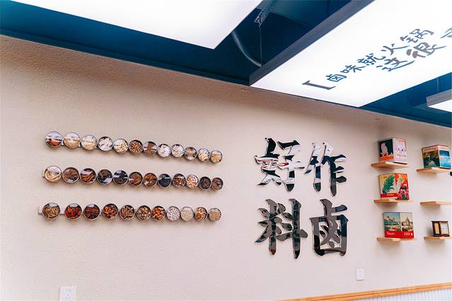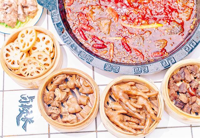 环境很好,没有街边市井的感觉,不管是店内的装修、服务员小姐姐们的衣服还是摆盘,感觉跟我之前吃的市井重庆店都不太一样,这个白色基墙的装修还有墙上挂上的卤料装饰,我有种来到以火锅为主题的甜品店的感觉,哈哈哈对!很像高端的甜品店。