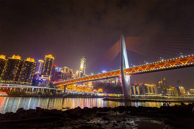 星光观景台超美!上去都要戴鞋套,地面是玻璃的防滑。玻璃里面有感应灯,踩一下会有彩色的光,此处可清晰地看东水门大桥和长江夜景。再往下走就可以近距离地看轻轨从桥下穿过了,要等上好几分钟才有一趟轻轨路过。再往下走有龙门书院,太晚了就没进去,还有一条布满彩灯的小路拍照很美,各种壁画浮雕。我觉得比网红洪崖洞其实要好看很多,也没有那么多的人人人人人。