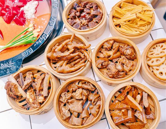 卤藕和卤鸡爪。是温热,可以直接吃。非常入味儿,鸡爪软糯入口即化,太美妙。一分咸,少一分淡,控制得好。一点都不辣,小朋友也能放心吃哦。当然也很适合不太能吃辣星人。卤蹄筋香滑,卤肥肠还保持着爽脆,猪脚卤后就是q弹,最爱吃还是卤牛肉,整体肉质细腻有弹性,卤香超级体现得出来,想想这些卤料再带上那香辣,美滋滋