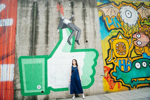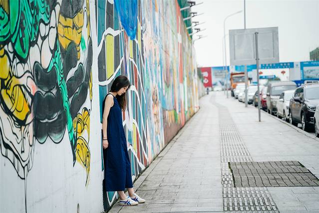 以大面积的涂鸦作为大背景,人物(我本人)融入其中~那天穿的是卡其色的风衣,没有很张扬但是非常适合背景。超级喜欢这张的,表白莫莫