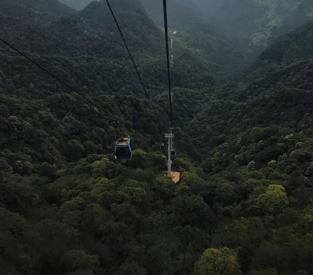 景区大门进去之后分为山下和山上两个部分,山脚主要就是碧潭幽谷的步道,大部分景点需要乘坐索道缆车上山,索道本身的角度是很大的,陡得让人心跳加速,半空中也可以俯瞰脚下的风景。不可否认,一览众山小的感觉会让人瞬间觉得不虚此行。