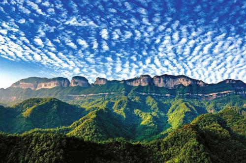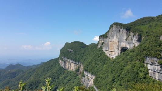 金佛山,顾名思义,连绵的山脉形似卧佛,而“金”字,则是形容夕阳照射在岩壁上呈现的色彩,夕阳西下的时候,山岩如同一尊金佛放出光芒,巍峨壮观。