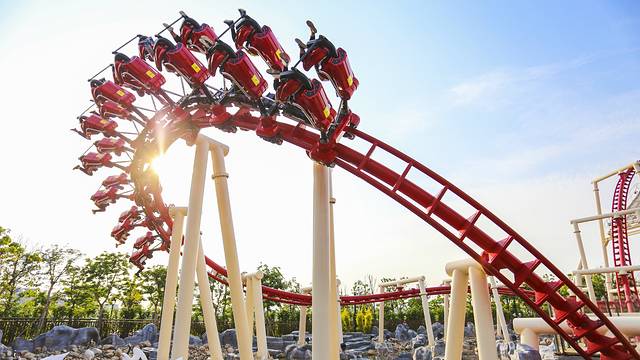 顺着主路往下走,可以看到一个通体红色的过山车,不要以为东方神画只有神话故事,想要玩刺激类的项目照样可以尽兴,不如就先从时空穿梭开始吧,悬挂式座椅的过山车在极速前进的同时更增加了失重感,随着风声尖叫出声也没关系。值得一提的是,时空穿梭身高限制为1米-2米,小朋友也可以体验!