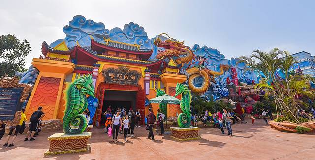 在许愿池旁最引人瞩目的建筑莫过于哪吒闹海了,。这个项目改编的就是早就家喻户晓的哪吒大战敖广的故事,龙王大水淹了陈塘关,哪吒大闹它的老巢海底龙宫,最后逼得他退水。戴上4D眼镜坐上游览车,全浸入式的体验过程中,除了超刺激还带着游客互动的打斗场景让人亢奋外,最神奇的应该是海底龙宫的造景了,一时间以为自己来了海洋馆……