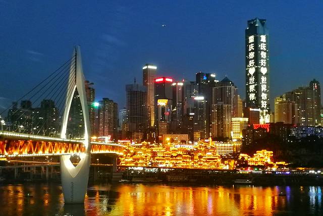 之前在抖音上看到过很多次洪崖洞的视频,但是自己亲眼看到的时候还是很震撼的,所有景物都在金色灯光的包裹下,辉煌璀璨的灯光,把重庆的凸显得非常的梦幻,不愧为现实版的千与千寻。
