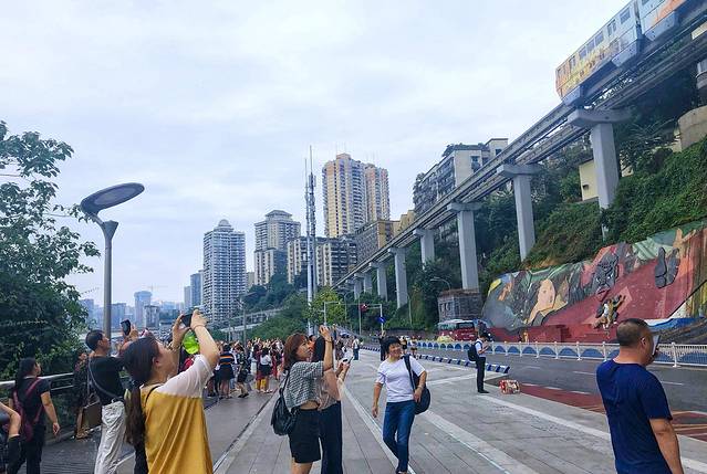 不得不说,景点魔幻,人文景观更魔幻,观景台上所有游客都统一姿势,举着手机45度仰望天空,等待轻轨到来。在轻轨上俯瞰应该更搞笑,男朋友当时还调侃说:“绝对没有李子坝治不好的颈椎病。”