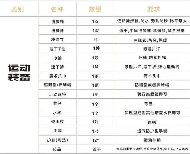 装备:专业户外登山鞋靴(必需),户外服,太阳帽,背包,水壶,登山仗等,以下列表供参考准备。当地气温略低于城区5~8度,自已酌带衣服。