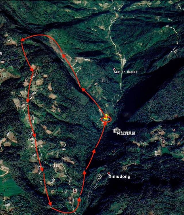 徒步路线:风鼓洞--- 犀牛洞洞内 --- 沿盘山公路至鹰子嘴--- 手扒岩--- 悬崖顶端--- 休息补给点--- 倒岩子--- 双天坑--- 快活岩(合龙口)--- 吊水岩 --- 沿青石古道返回