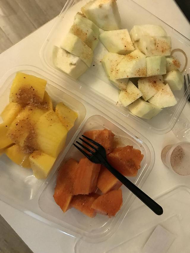 点的水果要撒辣椒和盐还是啥混合的末末,撒多了,有点咸