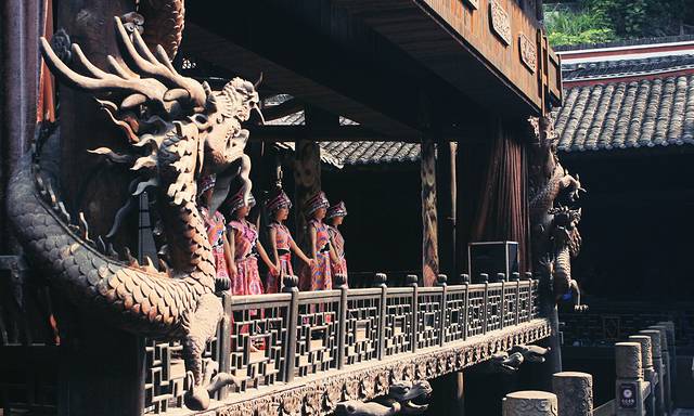 九进堂是整个土司城的核心部分,由333根柱子、333个石柱础、330道门、数千块雕花木窗、上千根檩子、上万根椽木组合而成。是目前国内罕见的纯榫卯相接的木结构建筑。九进堂内每天会安排表演,10:00/15:00各一场,时间约40min,感兴趣的可以按照时间点去看;