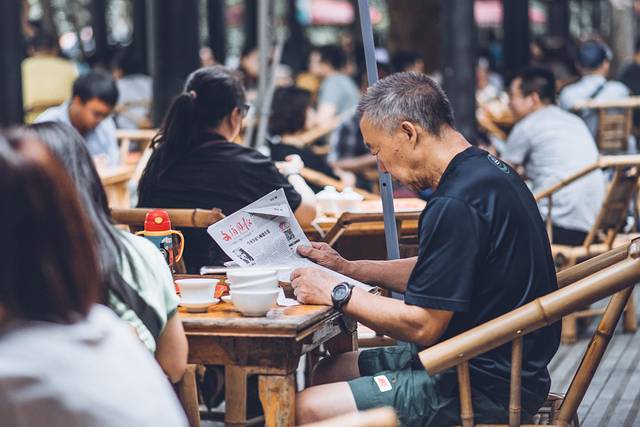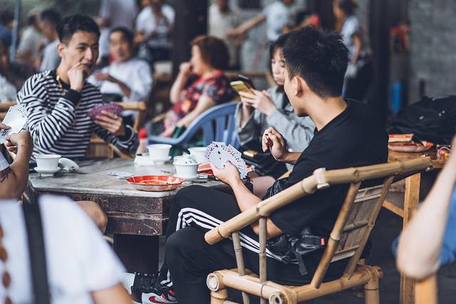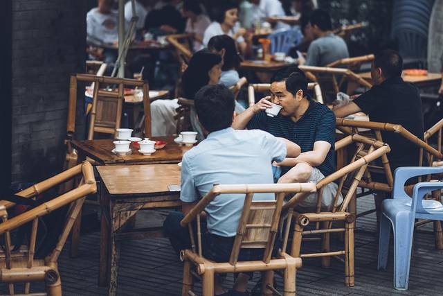 这里品茗最著名的是鹤鸣茶社,近百年的老牌子,竹椅矮捉盖碗茶,怡然自得。看报纸、喝茶、打牌。