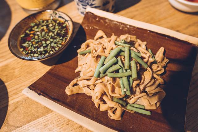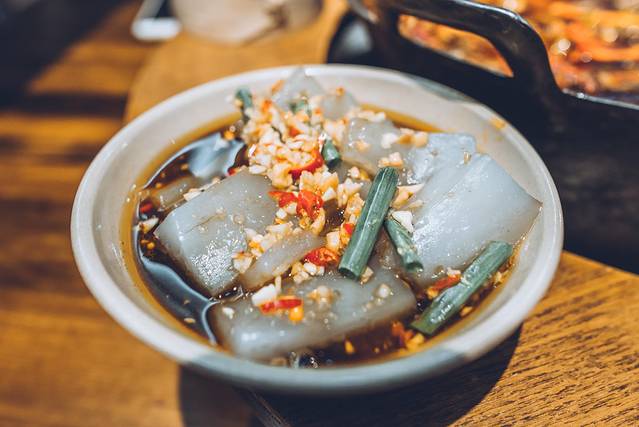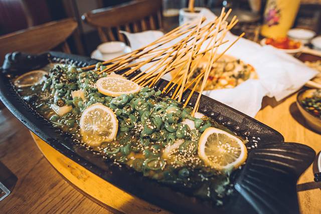 这盘川式青椒烤鱼片也是成都吃客非常有特色的一道菜,鱼肉无骨无刺,串在竹签上,柠檬提味,鲜香麻辣,底下的配菜也很丰富。除了以上这些外,绝情蛙、鱼香包浆豆腐、冒脑花等新派川菜也是这家店的推荐菜。