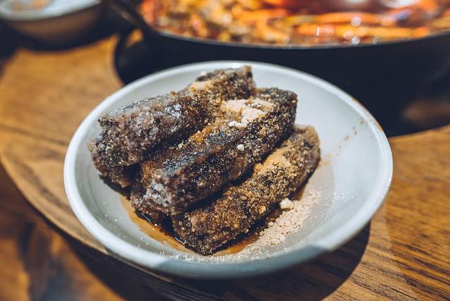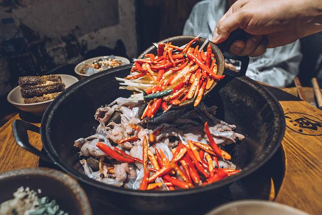 这家除了鱼之外,蛙肉也很有名。食材处理好后都端上桌来,由店员操作,依次放入铺有鹅卵石的铁锅里,然后将烧开的汤底倒进去之后立刻盖上盖子,“哗啦”一声响被“滋滋”声取代,是蛙肉在变熟的声音。只消3-4分钟,香气从密盖的锅里挣扎出来,钻入我的鼻子和脑子里。
