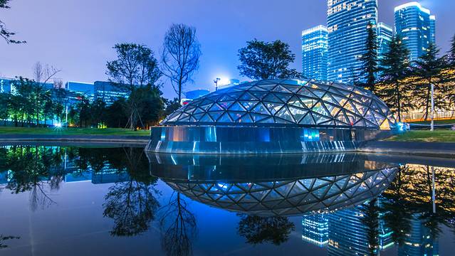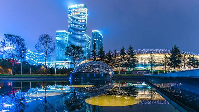 天府国际金融中心在白天里承担着成都金融业的发展,夜晚时,流光溢彩的金融中心用它的建筑美学和光美学征服了每一个来此处打卡的人。