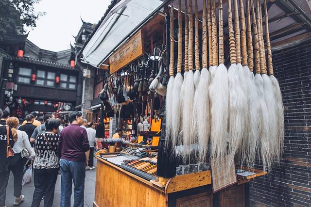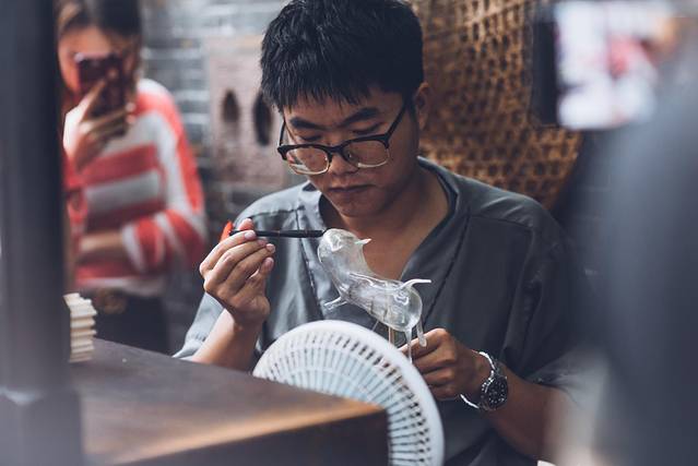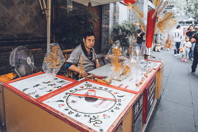画糖画、吹糖人,是锦里老少咸宜的娱乐,软软的热糖稀经过手艺人的这么左弄右弄,也不知是什么技巧,一个既好看又好吃的工艺品就做好了。若是有兴趣,可以自己做上一次,也算是特色文化的体验。
