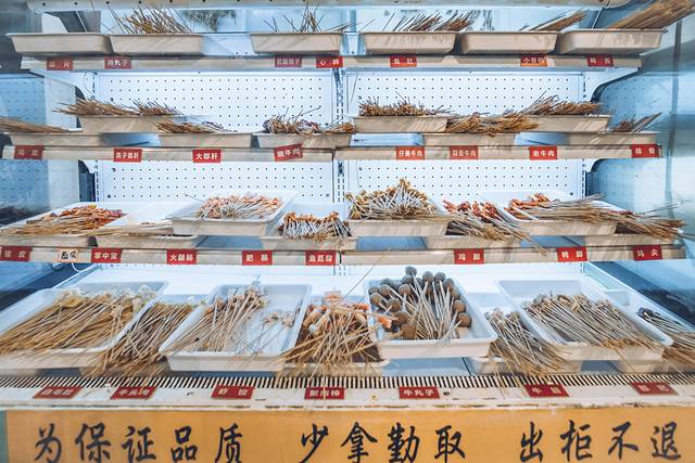 串串都放在大冷柜里,想吃什么自己拿就好,最后根据竹签的数量和盘子的颜色结账。