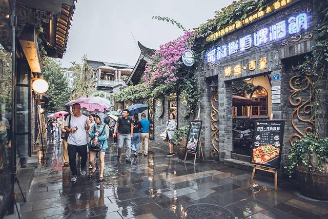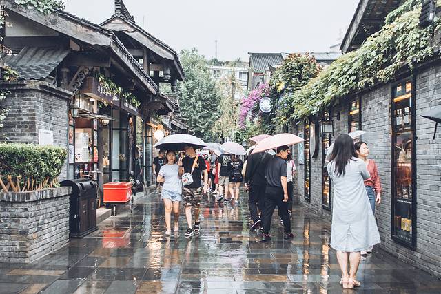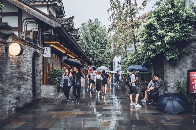 下着小雨的宽窄巷子透着一股子慵懒,人们撑着伞,随心地闲逛着这张成都的名片。