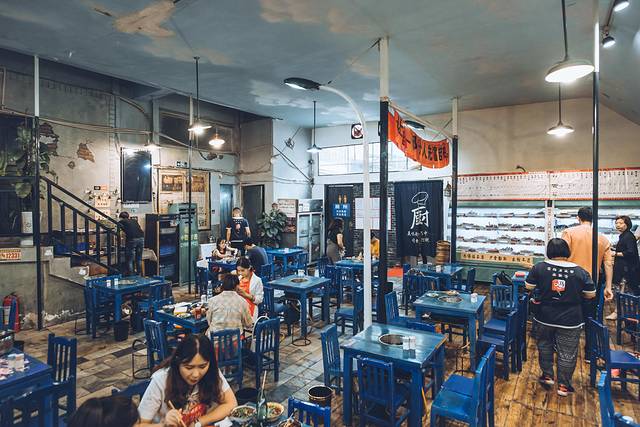 矮桌矮凳大壁画,用的老式的铝锅和煤气炉,看着墙上的壁画,就像回到了小时候在街边小店里吃东西的美好时光。热热闹闹的,充满了烟火气。