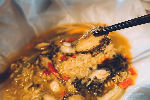 鲍鱼、蟹肉棒、丝瓜,料很足,鲍鱼不大但十分新鲜,藤椒口味,很创新的吃法。在一众食材的加持下,方便面也成为了一道灵魂美食,让人停不下来。