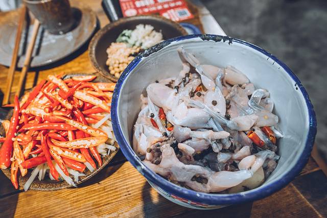 熟了的蛙肉鲜香四溢,再配上专制的味碟,蛙肉细嫩但又不失口感,一抿见骨,味道绝妙。