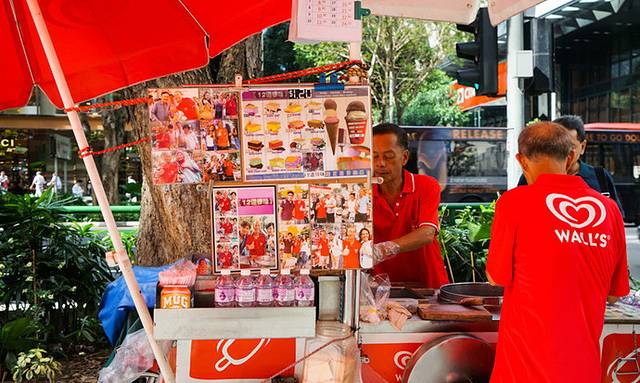 一辆简易的推车,一把红伞,几位穿着红衣服的老伯,贴着跟谢霆锋的合照~这家冰激凌上过《十二道锋味》之后,被国人熟知,变成一家网红冰激凌,每天都有很多人来排队买冰激凌吃。冰激凌的口味有很多,可以选择夹着面包/威化饼吃,入口即化,非常好吃😋