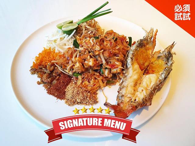 一开始觉得泰式炒河粉(也可翻译作泰式炒面或者炒粿条)在泰国来说比较普遍,但看到是菜单推介热门餐点的时候我们决定尝试一下。上菜后看了一眼就想流口水,赶紧开吃。第一口之后我俩默默抬头对视,各自都惊呆了——不点真的会后悔!作为一名土著泰国人来说吃过的炒牛河已经是数不胜数,但是整体水平做得这么到位的扪心自问是真的不多。对于中国人来说,在外面点普通的泰式炒牛河一般都会口感偏甜或者放油太多,但这家的炒牛河口味真的对崇尚养生的中等口味星人太友好,除了粉的口感一级有韧性之外,口味浓郁得来又咸甜适中不油腻,更不会偏干吃越吃越口渴。最重要是那只大河虾简直良心了,鲜美绝顶,老板能不能给我多来两只啊!要知道最普通的鲜虾炒河粉一般只放几颗小虾干,更别提新不新鲜了。然后调料的摆放也十分贴心合理,点缀在旁没有直接搅拌在一起,以防每个人口味不一样可以自行调配适合自己的味道,又再加十分。