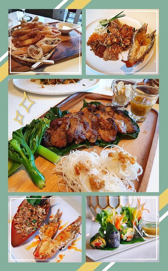 根据点评上的推荐,我们一共点了5道菜,ผัดไทกุ้งแม่น้ำทรงเครื่อง(鲜虾炒河粉),หมูคำหวาน(烤猪肉),ยำหัวปลีกุ้งลายเสือย่าง(凉拌香蕉花+烤老虎虾),set ของทอด A(炸春卷A套餐)以及ปอเปี๊ยะสดเรนโบว์เห็ดหอม(七彩香菇春卷)。菜品颜值超高,我才拍了个照的功夫,我朋友已经把虾头都啃干净了。
