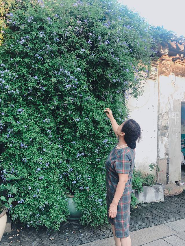 我是很喜欢花花草草的,自己养了一堆,每开一朵花都是一天中的大事,来到这边,各种植物琳琅满目,这一房多高的蓝雪花开的正欢,一层层一簇簇,是跳跃在暮光下的精灵。