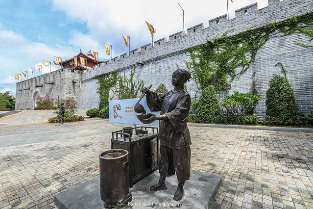 门前很多铜像,像是臭油街粉汤娘、鳌山书院老先生与学生、打铁街老铁匠、东门街药童、古城门守卒、轿夫辅轿夫、水南村农夫,这些生动形象,从神态和动作就能依稀可见曾经崖州古城的民间风貌。