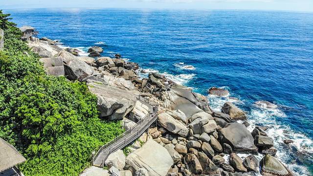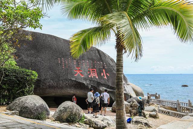 三亚 有15公里的椰梦长廊,在 大小洞天 刚入口处也有这样一段“小椰梦长廊”,高高的椰子树上,挂满了青黄不一的果实,它与银色的沙滩,蓝色的大海,组合成一幅色彩斑斓的长卷画图,举目远眺,海阔天空,碧波万顷,不远处的领海基点塔坚如 磐石 ,守卫着祖国的 南海 。