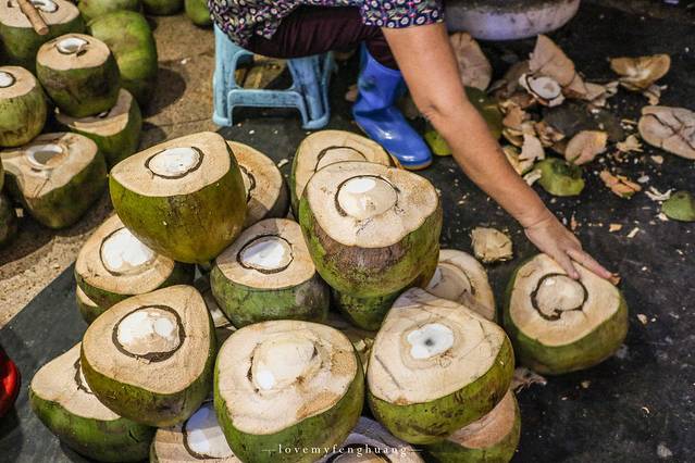 做椰子鸡,要先从砍椰子开始,店门外堆满了待砍的青椰子,师傅娴熟的手法,不一会功夫就将椰子砍开,饱满的汁水,飞溅出来。