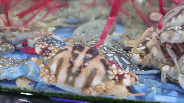 琳琅满目的海鲜,张牙舞爪的螃蟹就有十余种,还有老虎斑,各种鱼类、贝类、海虾……我们挑了好多种,准备找一家去加工。