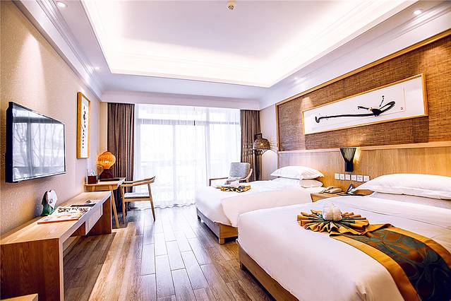 房间目测在25平左右,我们两个女生入住刚好。房间布置的风格很清新,简洁大方的墙纸与装饰画和窗外的风景相呼应,营造了一种舒适自然的氛围。房间灯光明亮,干净整洁,洗漱用品也都显得很有品质。